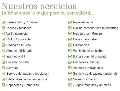 Hay cabañas de 1 y 2 dormitorios que están equipadas con TV LED, ventilador de techo o aire acondicionado en cada habitación, baño con bañera con hidromasaje, cocina con horno, calefactores en cada habitación, microondas, heladera con Freezer, vajilla completa, servicio de ropa blanca (cama y baño), hamaca paraguaya, cuna, bañera y sillita para bebe, mesas y sillas para usar en el exterior, cocheras techadas con asador individuales en cada cabaña y cocheras techadas adicionales para un segundo vehículo.